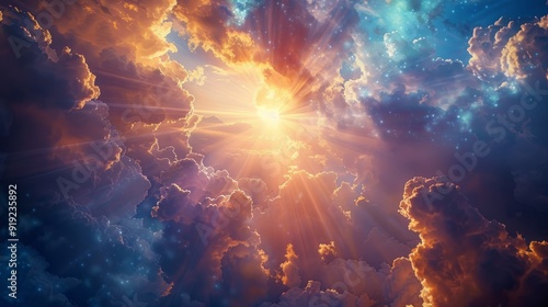 Dramatic sunset sky with vibrant clouds and sunbeams over a serene horizon