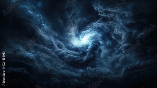 Dramatic swirling storm clouds illuminated by lightning