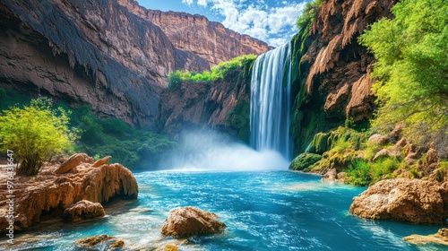 Dramatic thundering waterfall plunging over a towering rocky cliff into a pristine turquoise river below