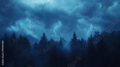 Dramatic thunderstorm over dense pine forest, multiple lightning bolts, ominous dark clouds, moody atmosphere, electric blue lightning strikes, towering evergreen trees.