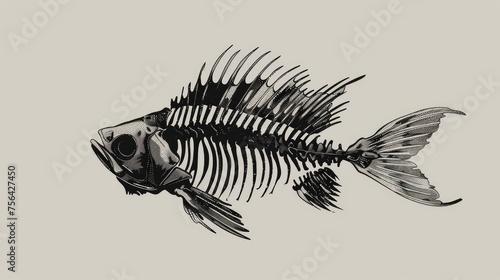 Drawing of a fish skeleton on a gray background. Fish skeleton. Fish bones