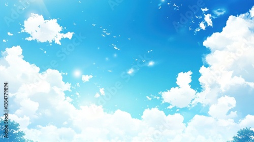Dreamy blue sky with cumulus clouds and sunlight, a refreshing summer day