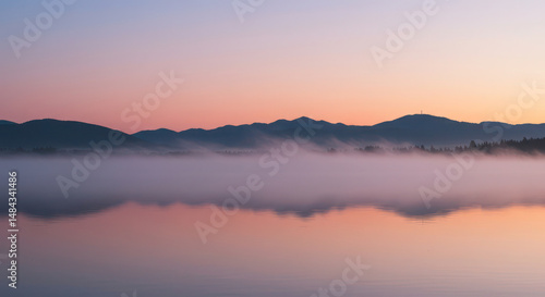 Dreamy dawn over a tranquil lake with mist and mountainous reflections