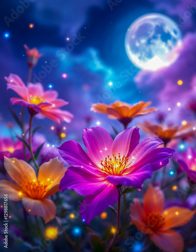 dreamy night garden with glowing flowers under a full moon, magical floral scenery with sparkling fireflies and vibrant pink and orange blossoms in a mystical atmosphere, fantasy nature background