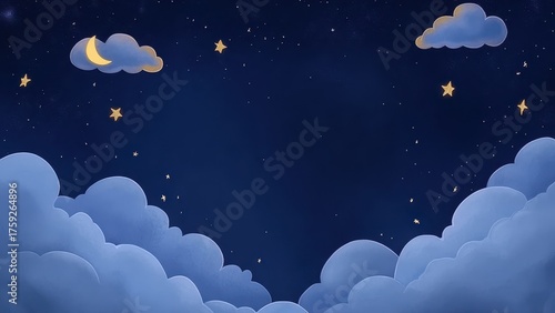 Dreamy night sky filled with glowing stars and fluffy clouds, perfect for lullabies and bedtime stories