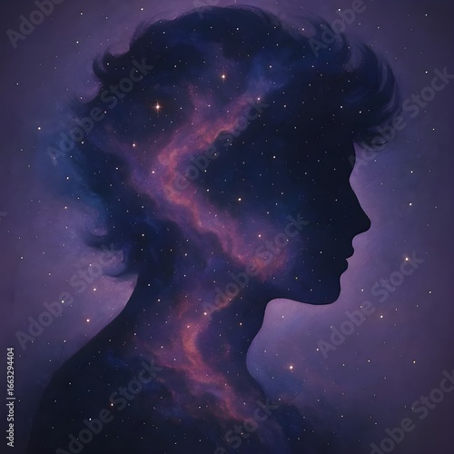 Dreamy silhouette of a man, his form filled with vibrant nebulae and stars, blending into a surreal cosmic scene.