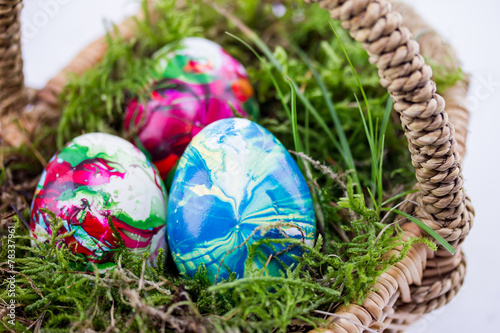 drei Ostereier in einem Korb mit Moos