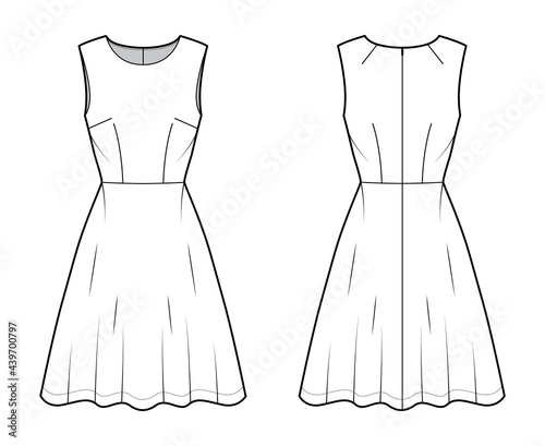 Dress flared skater technical fashion illustration with sleeveless, fitted body, knee length semi-circular skirt. Flat apparel front, back, white color style. Women, men unisex CAD mockup