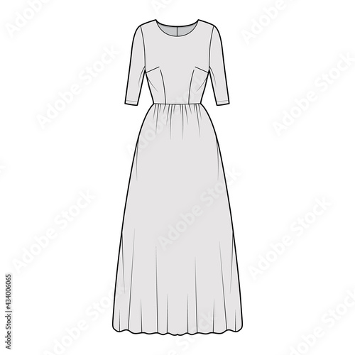 Dress long technical fashion illustration with elbow sleeve, fitted body, floor length full skirt. Flat apparel front, grey color style. Women, men unisex CAD mockup