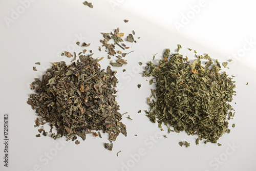 Dried basil with parsley on white background