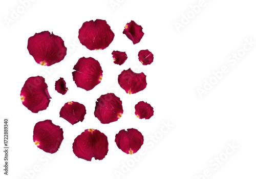 Dried crimson red rose petals with rustic texture and delicate veins, scattered on a pristine transparent background with ample copy space, flat lay, concept of transient elegance and natural beauty