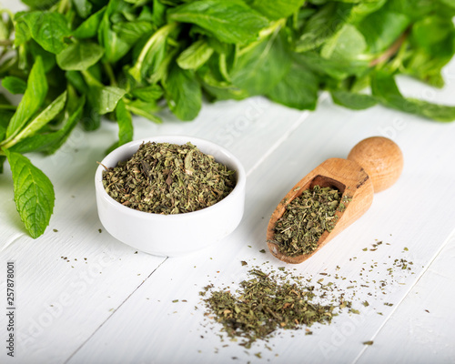 Dried peppermint in a white bowl and a bunch of fresh mint, on wooden background. Food background.