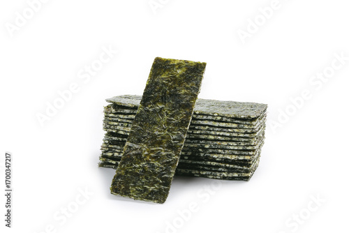 Dried seaweed nori sheets stack isolated on white background for Japanese cuisine cooking and sushi preparation