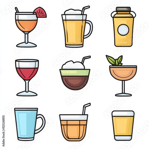 Drinks web icons in line style. Coffee, tea, soda, beer, alcohol, coctail, energy, wine, collection. Vector illustration.