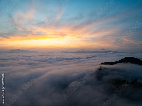 Drone aerial view of landscape fog over mountains in sunrise sky,High angle view over countryside at Southeast asia,Phang Nga Thailand,Wide angle view nature landscape
