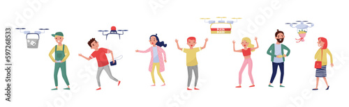 Drone Service and Delivery with People Characters Using Modern Smart Technology Vector Set