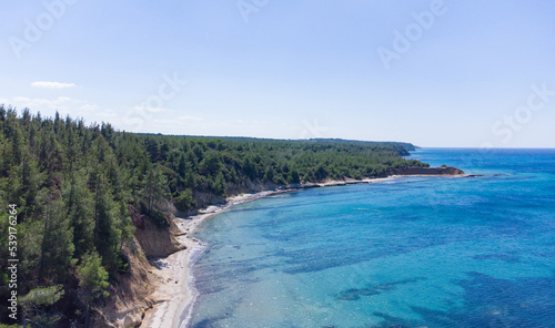 Drone view of crystal clear blue water on the beach of Kabatepe near Çanakkale, Turkey