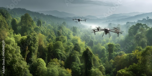 Drones with advanced lidar scan tropical rainforests, mapping biodiversity and deforestation, showcasing cutting-edge tech for nature conservation, ecological research, and forest preservation.