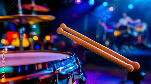 Drumsticks on snare drum, live music performance, blurred background, concert venue, for promotional material