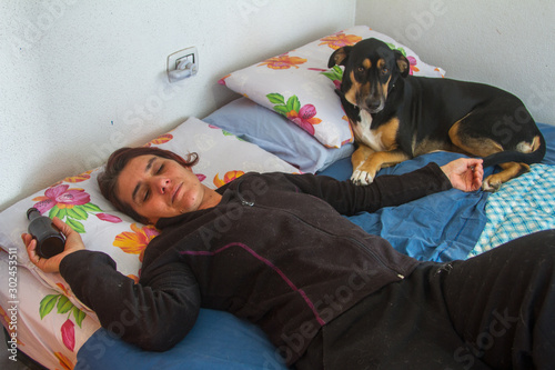 drunk girl drinking from the bottle in the bedroom on the bed with her beloved dog nearby