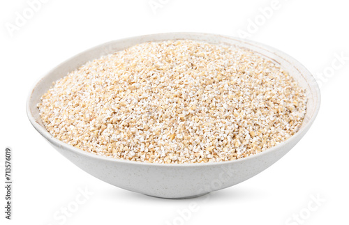 Dry barley groats in bowl isolated on white