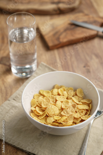 dry corn flakes for breakfast in bowl on table, breakfast preparation