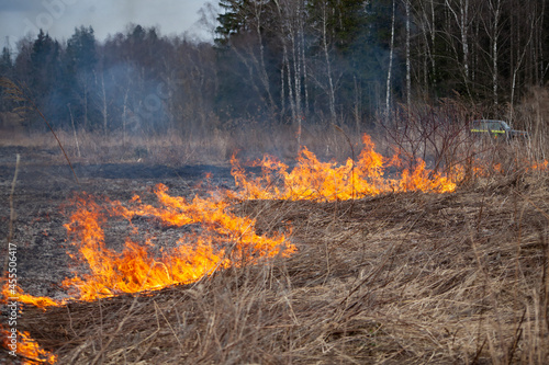Dry grass is burning. Fire in the field in spring.