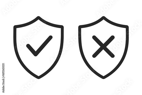 Dual shield icons with checkmark and cross outline showing approved secure access and denied unprotected status, cybersecurity verification UI app web safety concept, thin line vector illustration