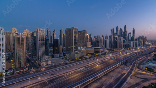 Dubai Marina skyscrapers aerial top view before sunrise from JLT in Dubai night to day timelapse, UAE.