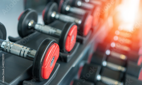 Dumbbells in modern fitness gym with light effect. View of weight training body builder equipment in workout room.Defocus dumbbell in exercise place.