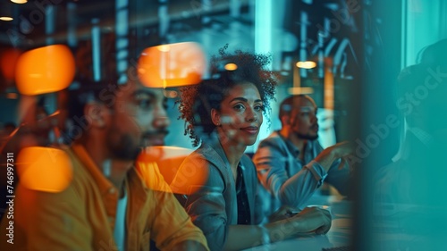 During an office meeting, male and female coworkers of different countries are standing and talking about company goals.
