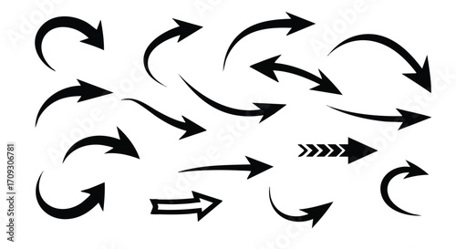 Dynamic black arrow icons set showing direction, progress, and movement on a white background
