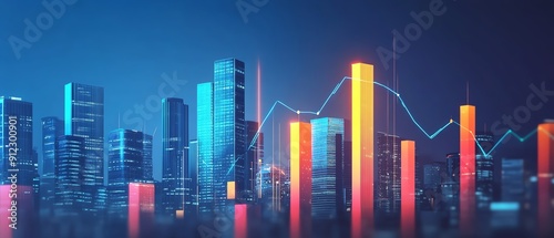 Dynamic city skyline with colorful growth chart illustrating business success and technology advancement.