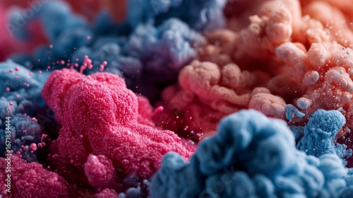 Dynamic colorful powder explosion in pink and blue clouds for abstract photography concept