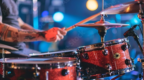 Dynamic drummer showcasing skill under brilliant stage lighting in an energetic performance