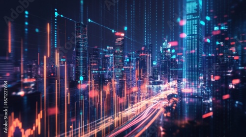 Dynamic forex trading visualization futuristic cityscape digital art high-tech environment aerial view glowing double exposure concept