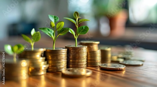 Dynamic growth concept showcasing plants emerging from coins, symbolizing financial investment and sustainability.