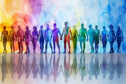 Dynamic illustration of diverse silhouettes walking together, symbolizing progress and unity with vibrant, bold colors in a modern, abstract style.