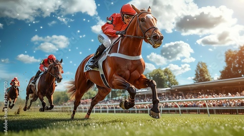 Dynamic illustration of horse racing with jockeys leaning forward, motion blur effect, energy and competition