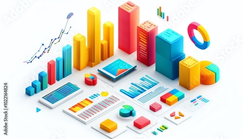 Dynamic isometric view of a business presentation, data report illustration, isolated on white background, bright colors, clear and informative