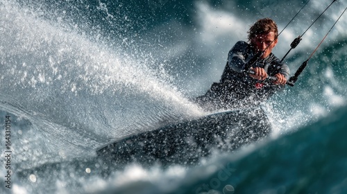 Dynamic kiteboarding action on ocean waves
