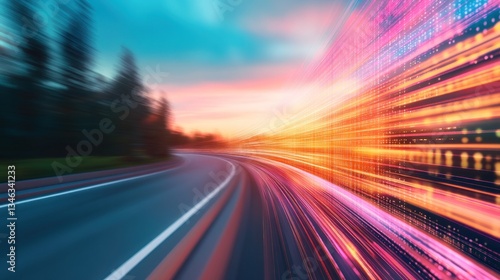 Dynamic motion capture of light trails on a curved road at sunset digital futuristic environment colors