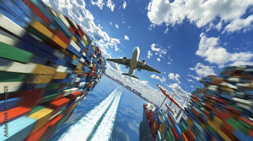 Dynamic perspective of aircraft banking above port with wake visible in water below, container cranes extending into sky, comprehensive view of intermodal operations including trains, trucks and
