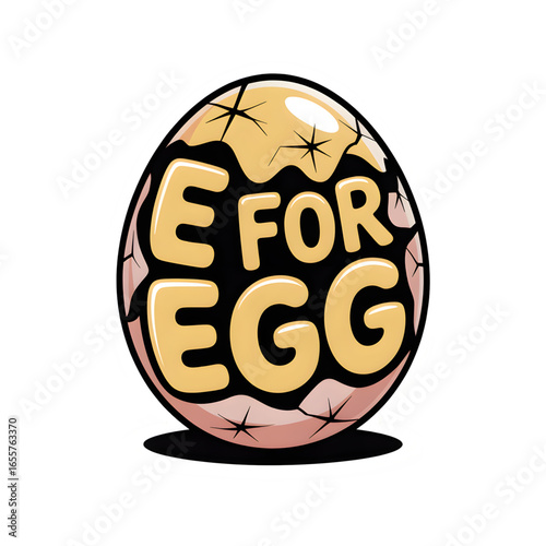 E for Egg sticker, sticker-like bruise, and "E for Egg" in bold, friendly letters. "E" alphabet