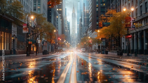 Early morning cityscape with the first light of day illuminating tall buildings, empty streets, and a peaceful, serene atmosphere