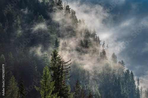 early morning foggy landscape inside Val San Nicolò, Pozza di Fassa, Dolomites, Italy