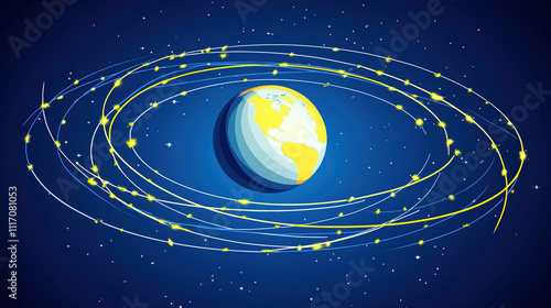 Earth axis diagram illustration showing the tilt of the Earth's rotational axis relative to its orbital plane, explaining the cause of seasonal changes and the distribution of sunlight.