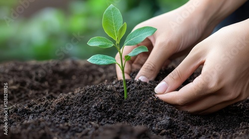 Earth day environmental concept. Hands carefully plant a young seedling into rich, dark soil, symbolizing growth.
