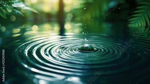 Earth droplet splashing in jungle pond, ripples, sunset background.