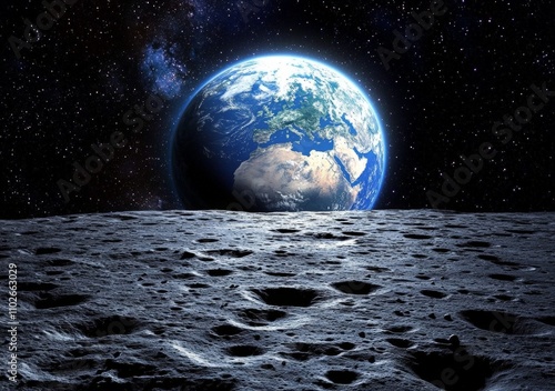 Earth from Lunar Surface with Craters and Stars in Vast Space